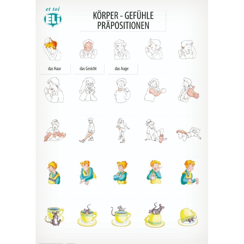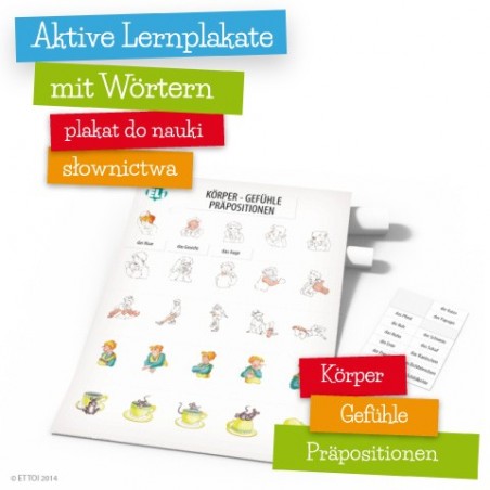 Plakat edukacyjny z serii Aktive Lernplakate mit Wörtern - nauka słówek niemieckich: ciało ludzkie/części ciała, uczucia/emocje, przyimki miejsca