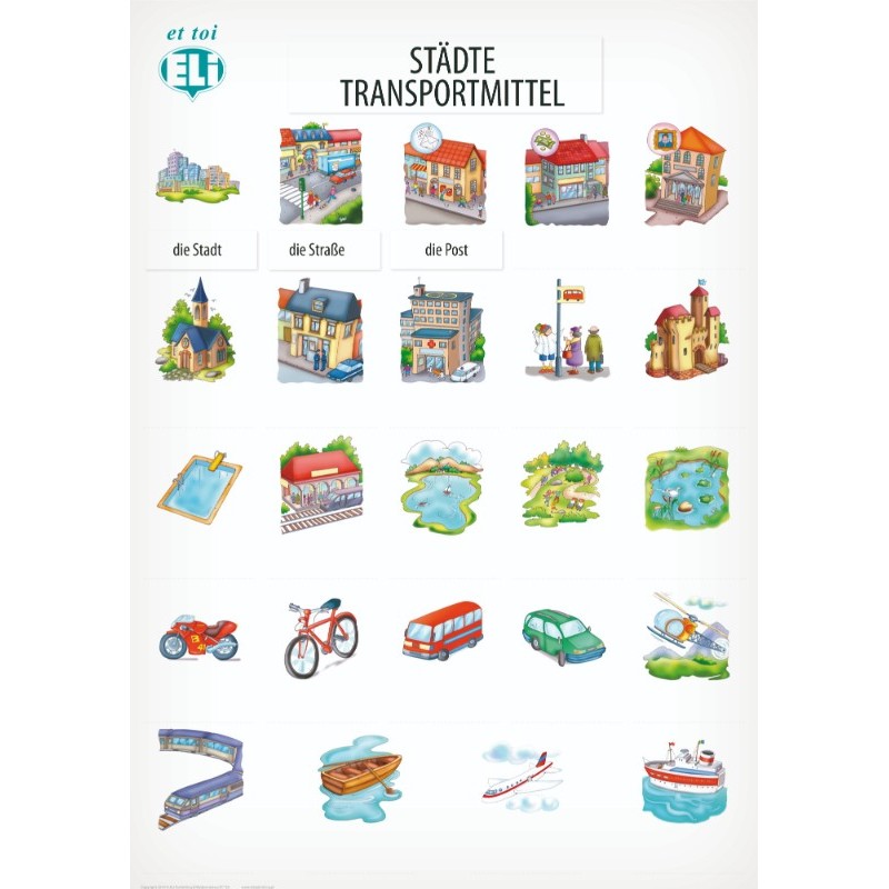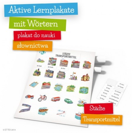 Plakat edukacyjny z serii Aktive Lernplakate mit Wörtern - nauka słówek niemieckich: miasto, środki transportu