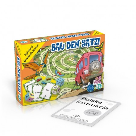 Bau den Satz! to planszowa gra językowa o tematyce podróżniczej, w której gracze uczestnicząc w niebezpiecznej eskapadzie w głąb dżungli, ćwiczą budowanie zdań w języku niemieckim z użyciem wylosowanych czasowników, trybów zdań i wyrażeń czasowych.