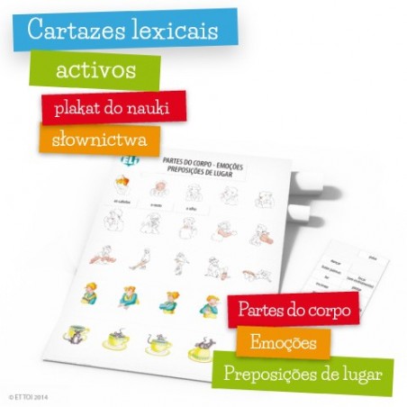 Plakat edukacyjny z serii Cartazes lexicais activos - nauka słówek portugalskich: ciało ludzkie/części ciała, uczucia/emocje, przyimki miejsca