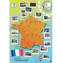 Plakat edukacyjny formatu 67,6x98cm przedstawiający mapę Francji wraz z jej urzędową nazwą i flagą państwową.