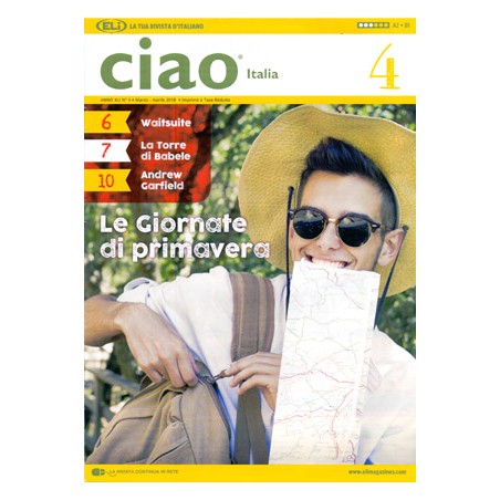 Czasopismo językowe Ciao - nr 4 - 2017/2018 (nagrania audio w formacie mp3 i materiały dla nauczyciela do ściągnięcia online). Poziom A2-B1 Europejskiego Systemu Opisu Kształcenia Językowego (Quadro Comune Europeo di Riferimento).