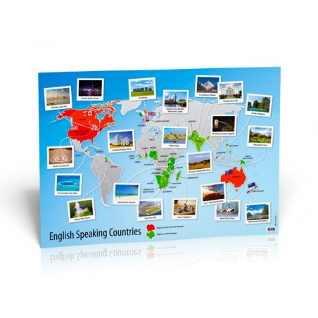 Plakat edukacyjny formatu 67,6x98cm przedstawiający kraje anglosfery na mapie świata. Uwzględnia podział na kraje, w których język angielski jest rodzimym językiem większości obywateli, oraz takie, w których ma status języka urzędowego.