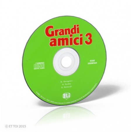 Grandi amici 3 CD – płyta CD audio do trzeciego poziomu kursu Grandi amici z wyliczankami, piosenkami, a także dodatkowymi ćwiczeniami na rozumienie ze słuchu.