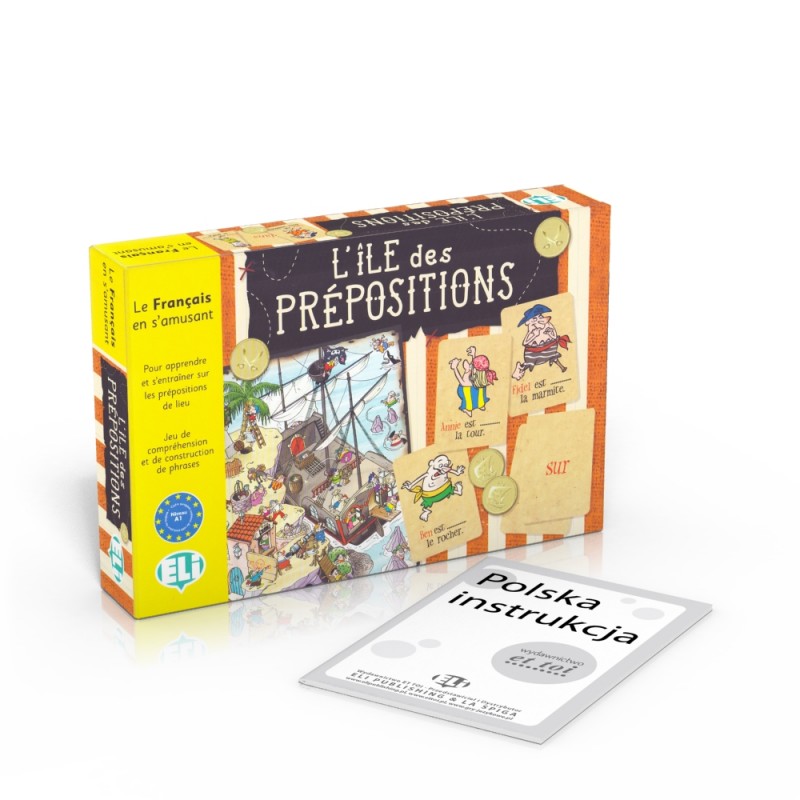 Gra językowa L'île des prépositions - edukacyjna gra planszowa do nauki francuskiego: przyimki miejsca (prépositions de lieu).