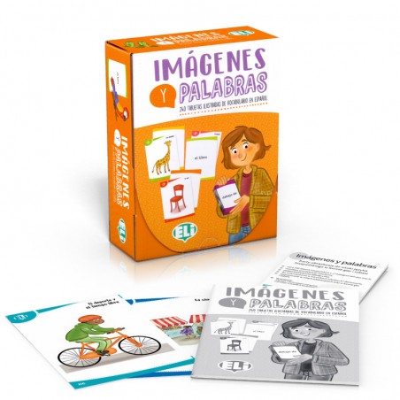 Imágenes y palabras - karty do nauki hiszpańskiego + e-flashcards z wymową: 240 ilustrowanych kart obrazkowych służących do gier i zabaw językowych oraz prostej nauki słówek na poziomie A1 - karty z wersją cyfrową online na tablice interaktywne i do nauki zdalnej.
