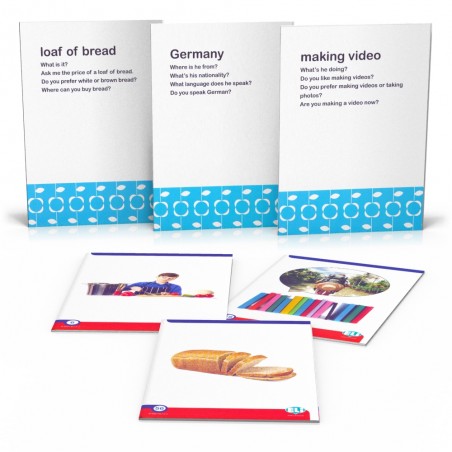 Każda z kart zawiera fotografię oraz umieszczony na odwrocie zestaw prostych pytań dotyczących danego przedmiotu, cechy, czynności, czy zjawiska i zachęcających do wypowiedzi na jego temat.