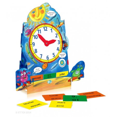 L'Horloge to rozkładany kartonowy zegar z kalendarzem wyposażony w ruchome wskazówki, obrotową tarczę z symbolami pogody oraz karty z nazwami dni i miesięcy.