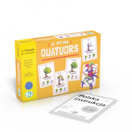 Le jeu des quatours to rozwijająca znajomość słownictwa gra karciana umożliwiająca szybkie opanowanie podstawowych wyrazów z 32 kategorii tematycznych takich jak dom, szkoła, ubrania, żywność czy przedmioty codziennego użytku.