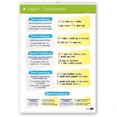Angielski plakat do gramatyki prezentujący tryby warunkowe. Plakat przeznaczony do klasy / sali lekcyjnej, dla dzieci i młodzieży, do szkoły podstawowej, liceum, szkoły językowej, dekoracji pokoju.