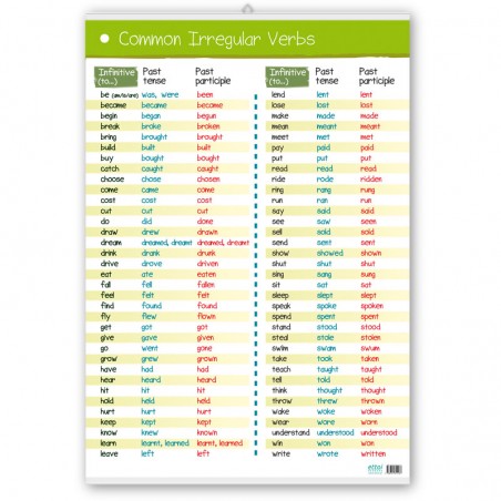 Angielski plakat do nauki słówek i gramatyki: plakat edukacyjny prezentujący popularne czasowniki nieregularne oraz ich formy. Plakat przeznaczony do klasy / sali lekcyjnej, dla dzieci i młodzieży, do szkoły podstawowej, liceum, szkoły językowej, dekoracji pokoju.