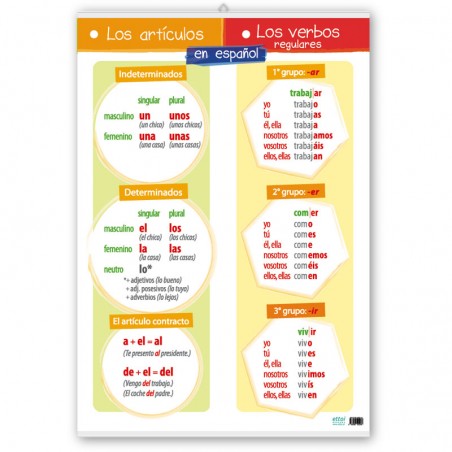 Hiszpański plakat do gramatyki prezentujący rodzajniki oraz odmiany czasowników. Plakat przeznaczony do klasy / sali lekcyjnej, dla dzieci i młodzieży, do szkoły podstawowej, liceum, szkoły językowej, dekoracji pokoju.