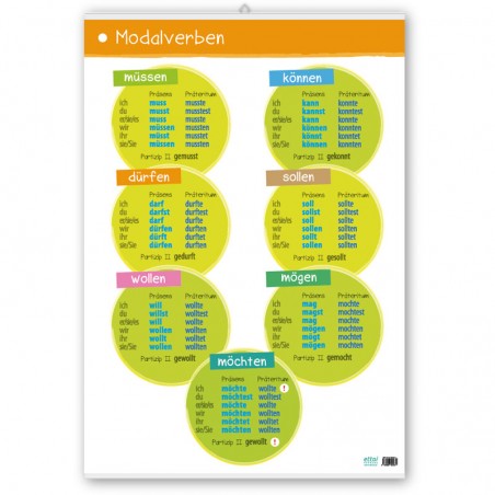 Niemiecki plakat do gramatyki prezentujący czasowniki modalne. Plakat przeznaczony do klasy / sali lekcyjnej, dla dzieci i młodzieży, do szkoły podstawowej, liceum, szkoły językowej, dekoracji pokoju.