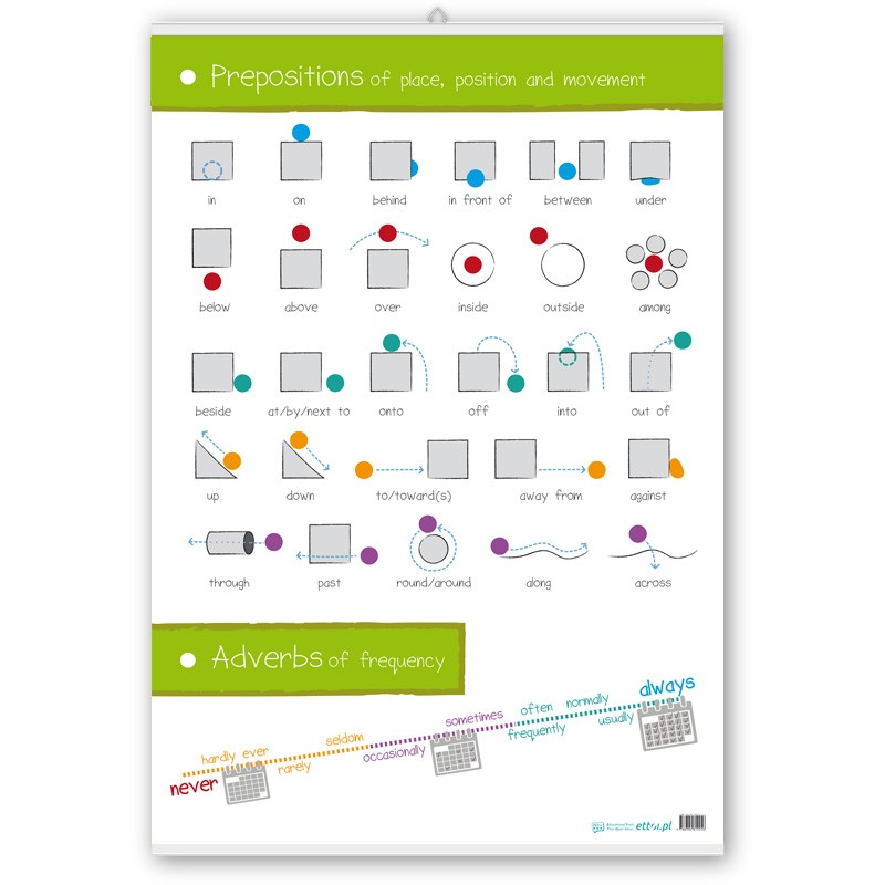 Angielski plakat do nauki słówek i gramatyki: plakat edukacyjny prezentujący przyimki angielskie związane z umiejscowieniem w przestrzeni i ruchem oraz przysłówki częstotliwości. Plakat przeznaczony do klasy / sali lekcyjnej, dla dzieci i młodzieży, do szkoły podstawowej, liceum, szkoły językowej, dekoracji pokoju.