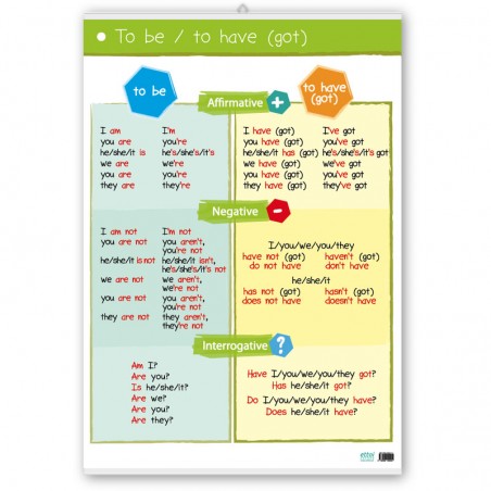 Angielski plakat do nauki gramatyki: to be / to have (got) . Plakat przeznaczony do klasy / sali lekcyjnej, dla dzieci i młodzieży, do szkoły podstawowej, liceum, szkoły językowej, dekoracji pokoju.