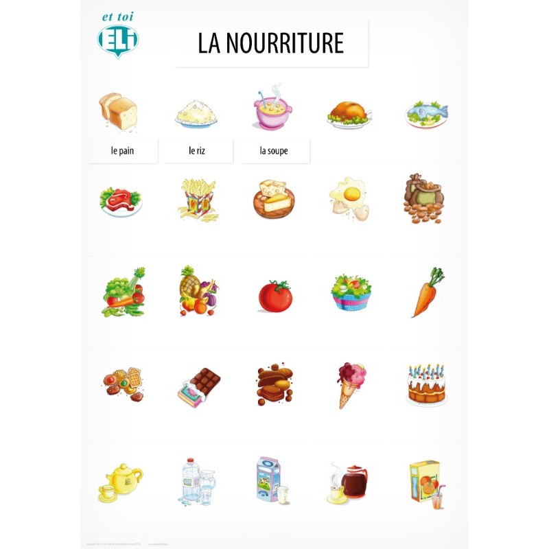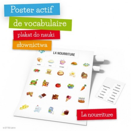 Plakat edukacyjny z serii Posters actifs de vocabulaire thématique - nauka słówek francuskich: jedzenie/żywność/artykuły spożywcze/napoje
