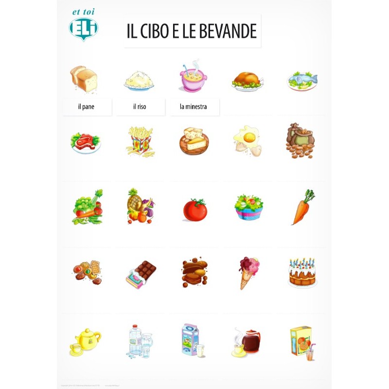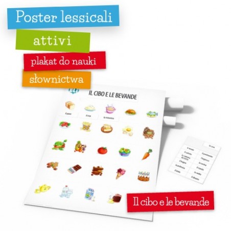 Plakat edukacyjny z serii Poster lessicali attivi - nauka słówek włoskich: jedzenie/żywność/artykuły spożywcze/napoje