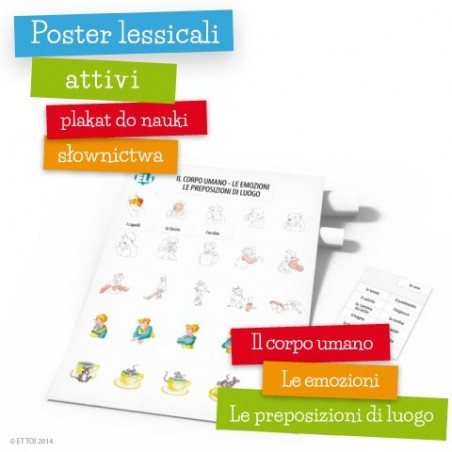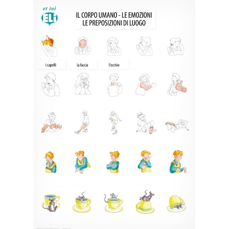 Plakat edukacyjny z serii Il corpo umano - le emozioni - le preposizioni di luogo - nauka słówek włoskich: ciało ludzkie/części ciała, uczucia/emocje, przyimki miejsca