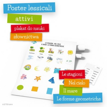 Plakat edukacyjny z serii Poster lessicali attivi - nauka słówek włoskich: pory roku, pogoda, plaża, kształty