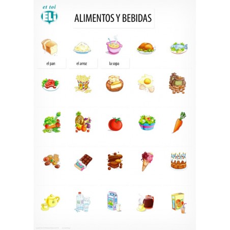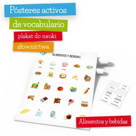 Plakat edukacyjny z serii Pósteres activos de vocabulario - nauka słówek hiszpańskich: jedzenie/żywność/artykuły spożywcze/napoje
