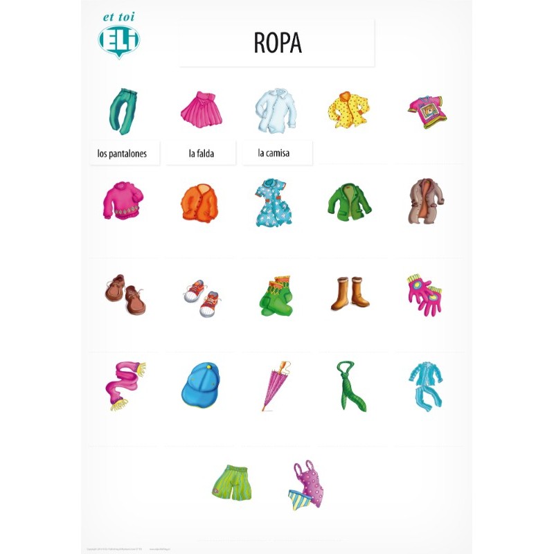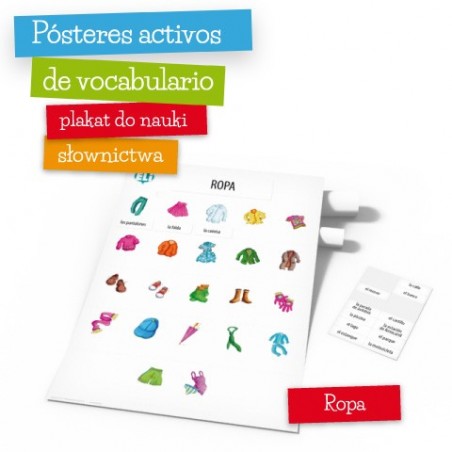 Plakat edukacyjny z serii Pósteres activos de vocabulario- nauka słówek hiszpańskich: ubrania/nazwy ubrań/odzież/części garderoby