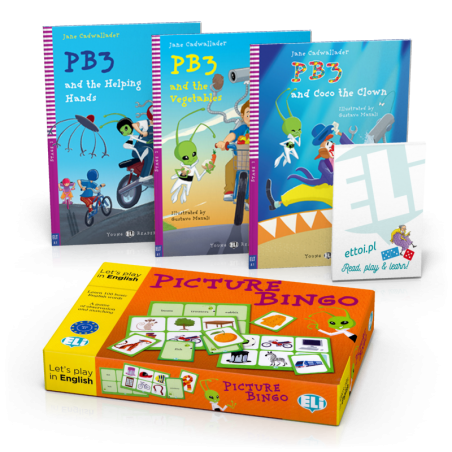 • trzy lektury o przygodach kosmity PB3 z serii Young ELI Readers wraz nagraniami audio mp3 (do wykorzystania również w formie audiobooka) i materiałami wideo;