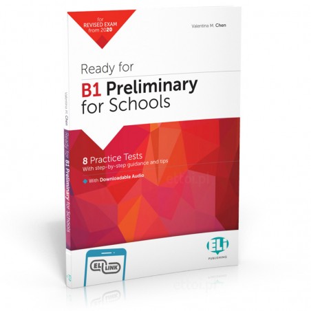 Ready for B1 Preliminary for Schools to zbiór materiałów przygotowujących do egzaminu Preliminary (dawniej PET) dostosowany do nowej formuły, która obowiązuje od 2020 roku. Książka zawiera 8 testów, w tym dwa opatrzone szczegółowym komentarzem i poradami, które pozwalają zbudować skuteczną strategię zdania egzaminu.