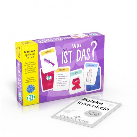 Was ist das? to rozwijająca znajomość słownictwa gra karciana w odgadywanie nazw popularnych przedmiotów na podstawie ich opisów prezentowanych w formie wskazówek typu: Z czego to jest zrobione? Jak to wygląda? Do czego służy? itd.