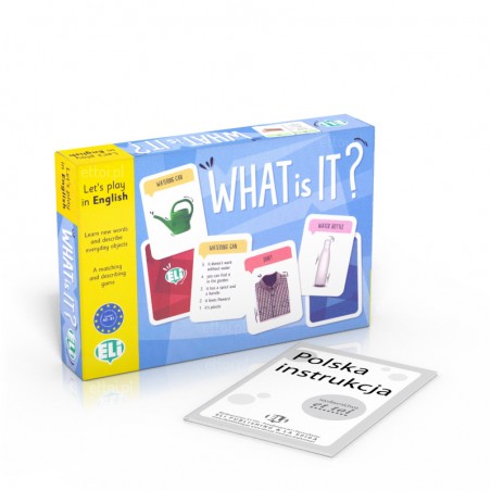 What is it? to rozwijająca znajomość słownictwa gra karciana w odgadywanie nazw popularnych przedmiotów na podstawie ich opisów prezentowanych w formie wskazówek typu: Z czego to jest zrobione? Jak to wygląda? Do czego służy? itd.
