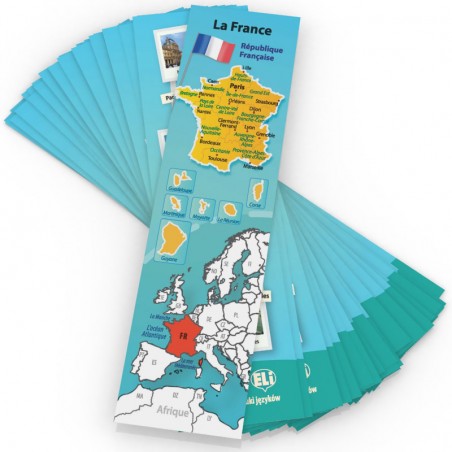 Dwustronna zakładka przedstawia mapkę Francji ze wskazaniem regionów oraz istotnych miast, a także prezentacją położenia Francji na tle Europy. Na odwrocie zakładki znajdują się zdjęcia kilku charakterystycznych dla Francji miejsc, budowli i zabytków.