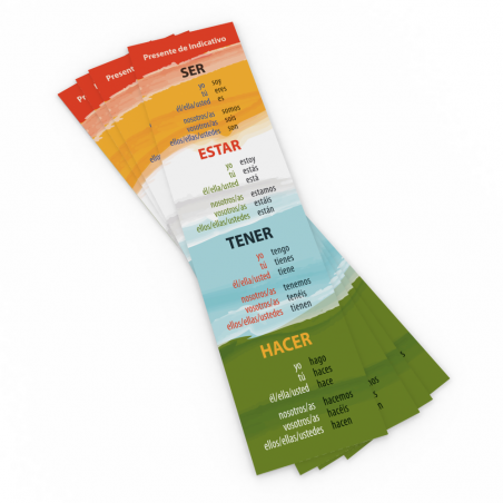 Zakładka edukacyjna z koniugacjami czasowników hiszpańskich ser, estar, tener i hacer.