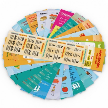 Zestaw dwunastu różnych zakładek prezentujących wybrane zagadnienia leksykalno-gramatyczne z języka włoskiego na różnych poziomach trudności w zakresie od A1 do B1/B2.