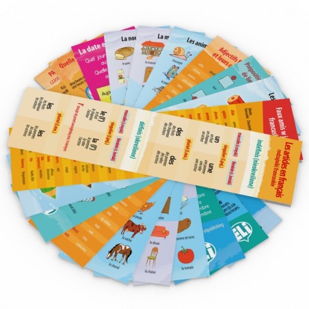 Zestaw jedenastu zakładek prezentujących wybrane zagadnienia leksykalne i gramatyczne z języka francuskiego na różnych poziomach trudności w zakresie od A1 do B1.
